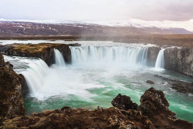 Heute wartet ein besonders erlebnisreicher Tag auf Sie. Zuerst fahren Sie zum Godafoss – Wasserfall der Götter. Im Jahre 1000 musste der Häuptling und Gesetzvertreter Thorgeir Thorkelsson entscheiden ob Island an Götter wie Thor und Odin oder am Christentum glauben sollte. Er entschloss sich für das Christentum und warf alle Götterstatuen in die Tiefe des Wasserfalls. Daher der Name. Weiter fahren Sie zum Myvatn. Der Myvatn liegt in einem vulkanisch aktiven Gebiet und bietet deswegen viele besondere Lavaformationen, mitunter Dimmuborgir. Die unterirdischen warmen Quellen bieten ideelle Konditionen für Plankton, was Insekten und daraufhin viele Vögel anzieht. Sie fahren weiter zu Namaskard – ein Solfatarenfeld, nicht weit vomMyvatn entfernt. Hier brodeln Schlammtümpel und der Schwefel und andere Mineralien verwandeln die Landschaft in eine bunte Hexenküche. Übernachtung mit Frühstück und Abendessen im Austur Hotel.